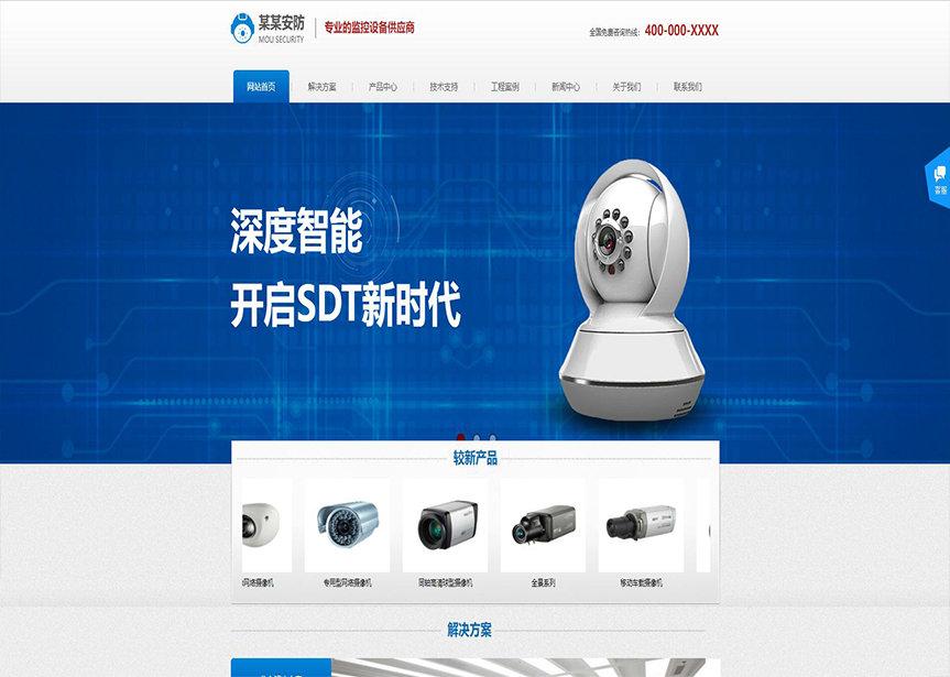 模板名稱:(帶手機版數據同步)自適應安防監控器材類藍色網站模板