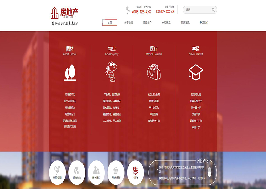 模板名称:(带手机版数据同步)自适应房地产类红色通用网站模板