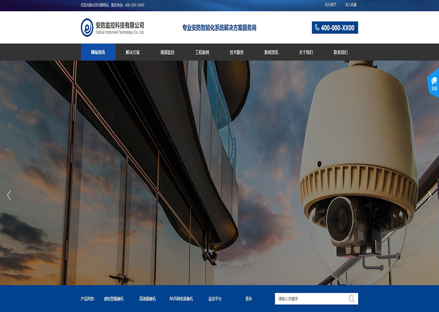 模板名稱:(帶手機版數據同步)自適應安防監控器材類藍色網站模板